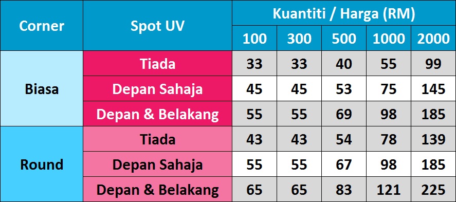 | Spot UV | Tiada, Depan Sahaja, Depan & Belakang |