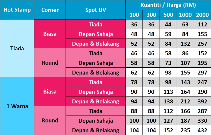 | Kuantiti | 100, 300, 500, 1000, 2000 |