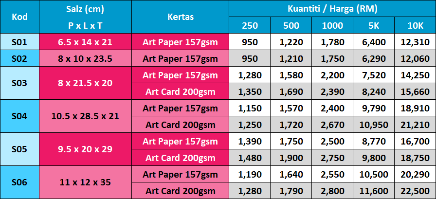 | Kuantiti | 250, 500, 1,000, 5,000, 10,000 |