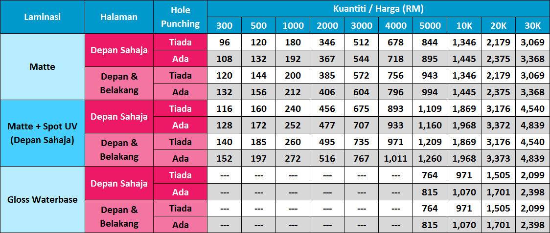 Kuantiti | 300, 500, 1,000, 2,000, 3,000, 4,000, 5,000, 10,000, 20,000, 30,000 |
